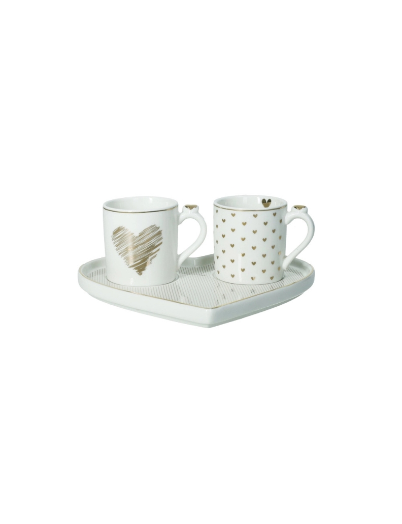Tête-à-tête “Amore Mio” Brandani, set composto da 2 tazzine da caffè e un vassoio a forma di cuore in porcellana decorata con righe e cuori dorati. Perfetto per una pausa caffè romantica e speciale. Un’idea regalo originale per coppie e innamorati.