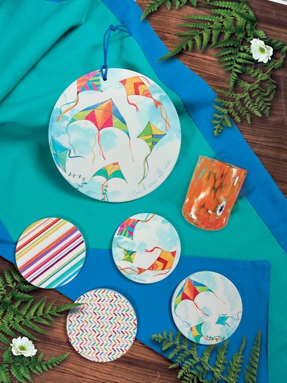 Aggiungi un tocco di colore e versatilità alla tua casa con il set di 4 decorazioni Aria di Brandani. Realizzate con un vivace design di aquiloni che richiamano la spensieratezza dell’aria aperta, queste decorazioni in ceramica possono essere utilizzate in molteplici modi. Sono perfette come originali sottobicchieri per proteggere i tuoi mobili da macchie e graffi, ideali come sottotazza per le tue tazzine di caffè o tè, e anche come pratici sotto moka per la tua caffettiera. Grazie al loro design accattivante, possono essere utilizzate anche come elementi decorativi per abbellire mensole, tavolini o pareti. Un set funzionale e stiloso che porta un pizzico di allegria in ogni ambiente.