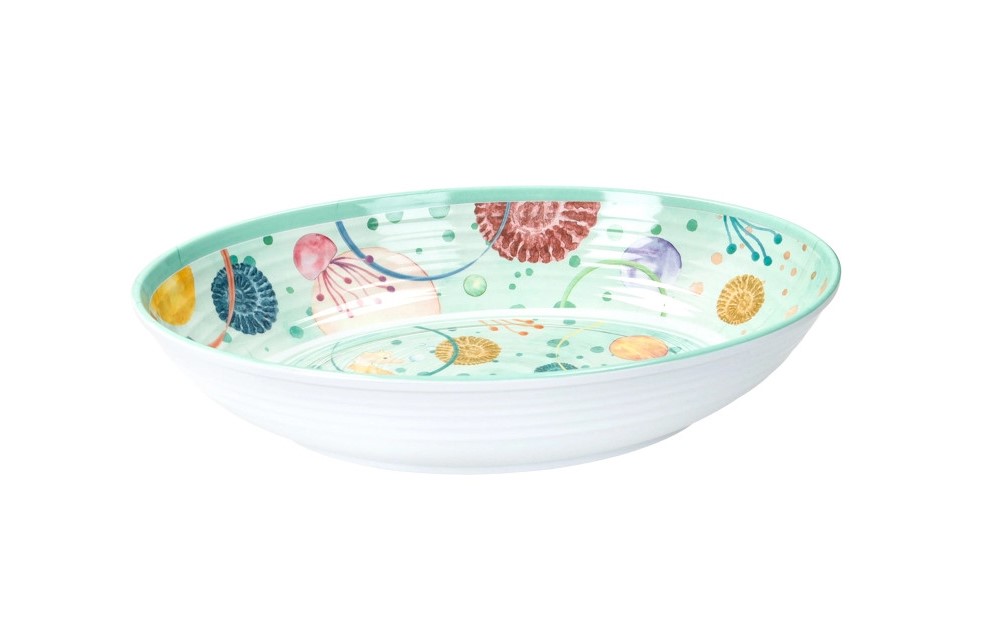 Caratterizzata da un’affascinante forma ovale e un bordo leggermente ondulato, la ciotola sfoggia l’iconico decoro della linea Bollicine: un acquerello sottomarino dove creature marine come meduse, conchiglie e bollicine galleggiano su un fondo color tiffany. La melamina di alta qualità garantisce una finitura lucida simile alla ceramica, ma con la praticità di un materiale leggero e praticamente infrangibile, ideale per chi ama pranzare in giardino o in barca.