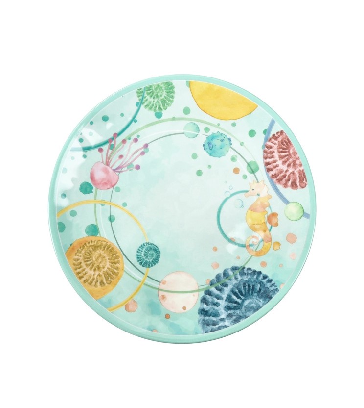 Il decoro richiama le profondità oceaniche con illustrazioni delicate di cavallucci marini, conchiglie e bollicine galleggianti, il tutto incorniciato da un bordo color acqua marina. Grazie al materiale infrangibile e leggero, è il compagno inseparabile per pranzi in giardino, cene in terrazza o buffet estivi, garantendo massima praticità senza rinunciare allo stile distintivo di Brandani.