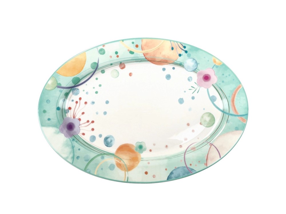 Completa il tuo set con il Vassoio Ovale Bollicine firmato Brandani. Questo pezzo iconico unisce la classicità della forma ovale alla modernità di un decoro fresco e sbarazzino. Caratterizzato da pennellate acquerellate nei toni del verde acqua, arancio e rosa, trasforma ogni portata in una presentazione scenografica.