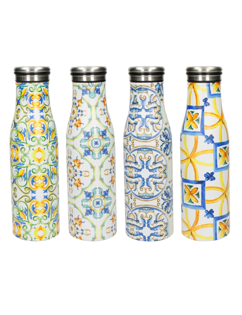 Questa bottiglia termica si distingue per il suo design unico, ispirato alle tradizionali maioliche italiane. La sua superficie esterna è rivestita con decorazioni colorate e vivaci, che richiamano i motivi tipici delle ceramiche decorate.