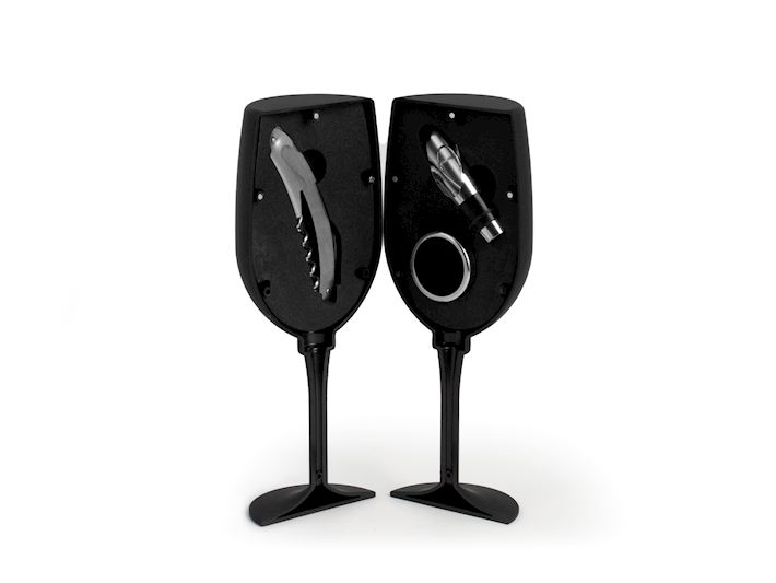 Questo tipo di set è molto popolare e include gli accessori: cavatappi, collare salvagoccia e tappo. La forma a calice è un’idea originale e lo rende un regalo perfetto per gli appassionati di vino.