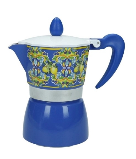 Realizzata in alluminio di alta qualità, questa caffettiera è specificamente progettata per essere compatibile con tutti i piani cottura, inclusa l’induzione, offrendo massima versatilità e performance. Il suo corpo inferiore in un intenso blu brillante si abbina perfettamente al serbatoio superiore, che sfoggia un vivace decoro ispirato alle maioliche mediterranee, con limoni, foglie e motivi geometrici nei toni del giallo, verde e blu. Il manico e il pomello del coperchio, anch’essi in blu, completano il design armonioso e colorato.