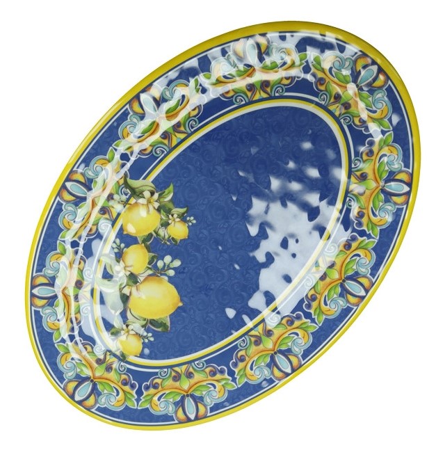 Il vassoio è un’esplosione di colori e tradizione: il centro è dominato da un vibrante blu cobalto che ricorda il mare profondo, mentre il bordo è impreziosito da un intricato motivo di limoni succosi, volute eleganti e foglie stilizzate in tonalità di giallo brillante, blu intenso e verde brillante, tutti ispirati alle classiche maioliche italiane. La sua forma ovale e le dimensioni generose lo rendono ideale per servire con stile.