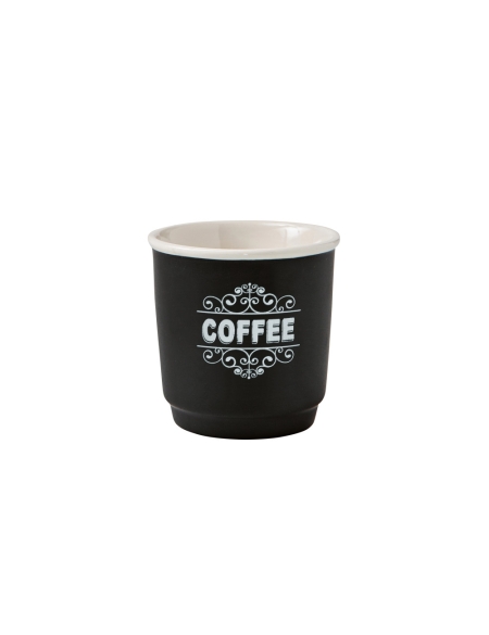 Il bicchierino è impreziosito da una decorazione bianca che recita “COFFEE” in un’elegante cornice con motivi ornamentali, richiamando lo stile vintage e aggiungendo un tocco di personalità. Ideale per servire il caffè espresso, il suo spessore aiuta a mantenere la temperatura della bevanda più a lungo.