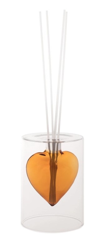 Elegante diffusore di fragranza Brandani con cuore in vetro ambrato e bastoncini in fibra ottica. Crea un’atmosfera calda e rilassante nella tua casa.