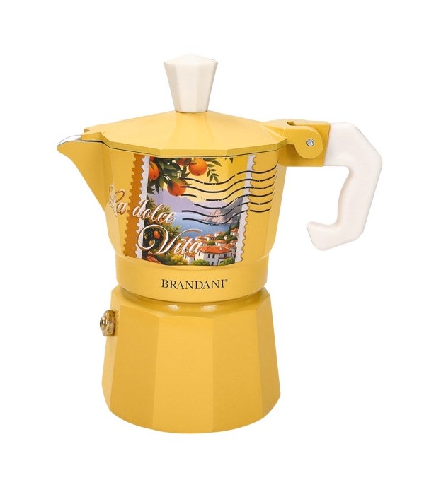 Questa moka da 1 tazza non è solo uno strumento per preparare un ottimo caffè, ma un elemento d’arredo iconico. Il corpo giallo ocra è impreziosito da un decoro vintage che ritrae paesaggi costieri mediterranei, incorniciati come in una cartolina d’altri tempi. La struttura in alluminio di alta qualità assicura una distribuzione perfetta del calore per un espresso aromatico, mentre il design della collezione Dolce Vita aggiunge un tocco di gioia e calore a ogni risveglio.
