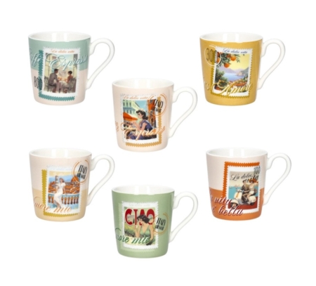 La collezione Dolce Vita di Brandani trasforma la tua tavola in un set cinematografico d’altri tempi. Ogni tazzina del set è decorata con illustrazioni in stile cartolina vintage, arricchite da scritte evocative come “Ciao Amore”, “La Dolce Vita” e “Cuore Mio”, che richiamano l’atmosfera vibrante e sognante dell’Italia degli anni ’50 e ’60.