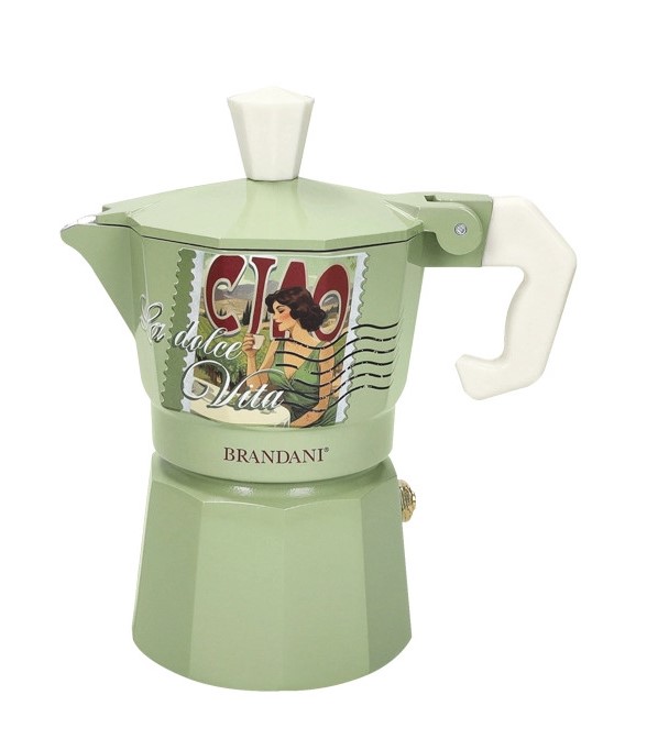 Questa moka da 1 tazza si distingue per il suo design unico: il corpo color pastello ospita un decoro a “cartolina” che ritrae una figura femminile iconica accompagnata dalla scritta “CIAO”, evocando l’accoglienza e il calore tipici del nostro Paese. La combinazione tra la parte superiore e la base in alluminio assicura un caffè dal gusto autentico e una perfetta distribuzione del calore. È l’accessorio ideale per chi desidera trasformare il rito quotidiano del caffè in un momento di stile inconfondibile.