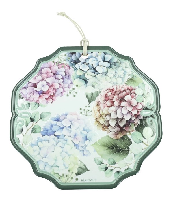 La decorazione presenta una base in ceramica di alta qualità con una forma poligonale e bordi leggermente ondulati, che le conferiscono un aspetto delicato e sofisticato. La superficie è adornata da un magnifico motivo floreale che riproduce le sfumature delicate delle ortensie in colori pastello, evocando un’atmosfera primaverile e romantica. Il retro è rivestito in sughero, garantendo stabilità e protezione per le superfici.