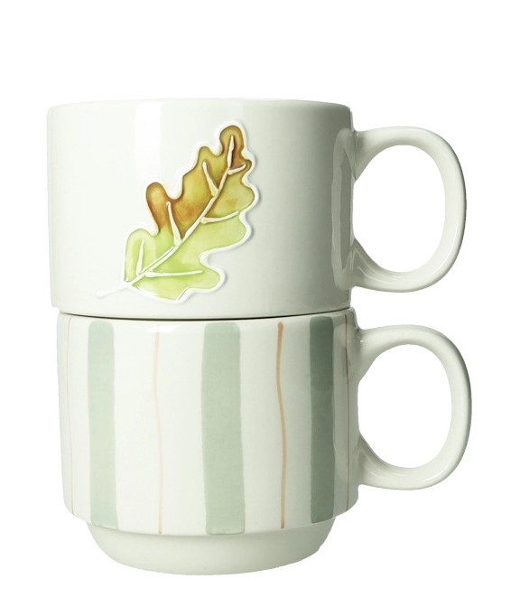 Realizzate in resistente stoneware, queste tazze impilabili sono ideali per chi ha poco spazio ma non vuole rinunciare all’eleganza. Una tazza è decorata con un motivo a righe verticali in delicate tonalità verdi e color terra, che richiamano i colori della natura. L’altra tazza presenta una bellissima foglia di quercia stilizzata in rilievo, con sfumature che vanno dal verde tenue al marrone dorato, catturando perfettamente l’essenza della stagione autunnale. La possibilità di impilarle le rende facili da riporre e sempre a portata di mano.