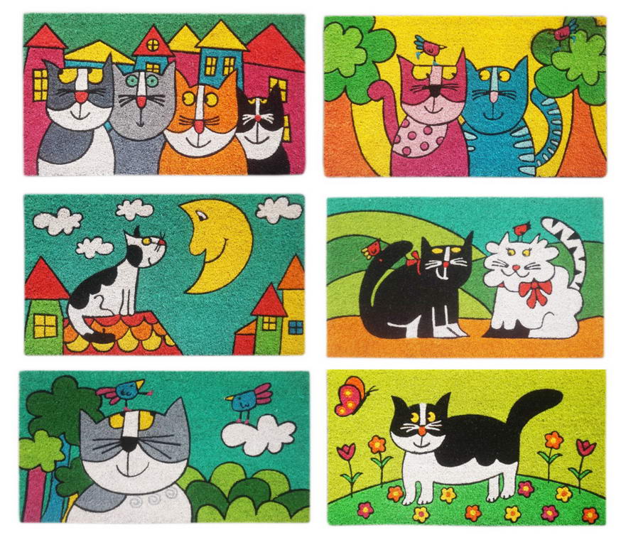 Questo zerbino fa parte della vivace collezione Naif ed è pensato per chi ama gli animali e desidera un ingresso che comunichi calore e simpatia. Caratterizzato da illustrazioni giocose, ritrae simpatici gatti in diverse situazioni: in compagnia di piccoli uccellini colorati, mentre ammirano la luna sui tetti o immersi in giardini fioriti insieme a farfalle. I colori brillanti e il tratto stilizzato tipico dell’arte Naif trasformano un oggetto funzionale in un vero elemento d’arredo che dona personalità immediata al tuo pianerottolo o alla tua veranda.