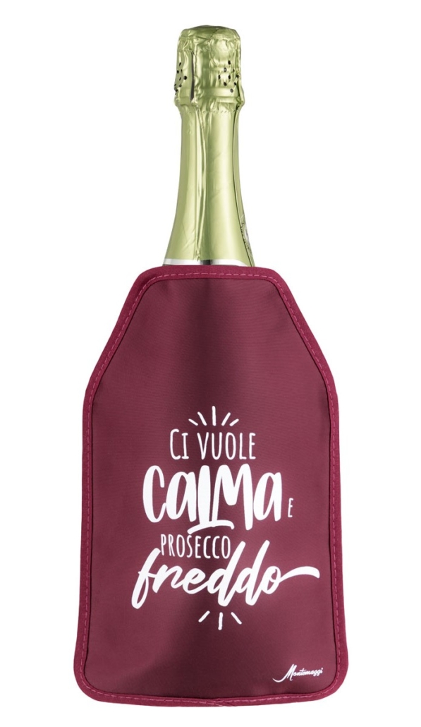 Glacette in tessuto isolante di colore bordeaux con la frase “Ci Vuole Calma e Prosecco Freddo”. L’accessorio ideale per mantenere fresca la tua bottiglia con un tocco di simpatia.