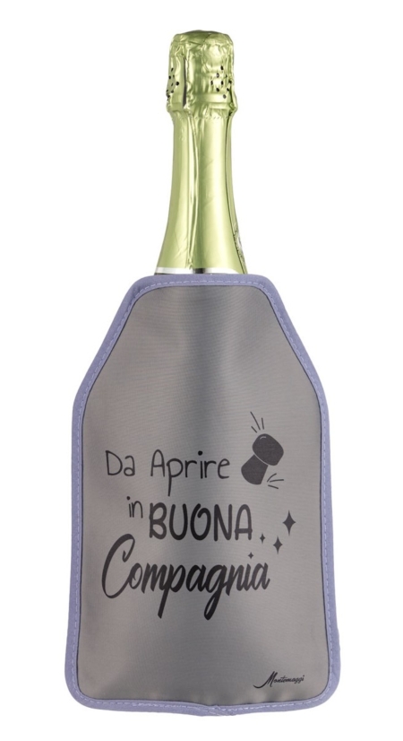 Glacette in tessuto isolante con la frase “Da Aprire in Buona Compagnia”, ideale per mantenere fresche le tue bottiglie di vino o spumante.