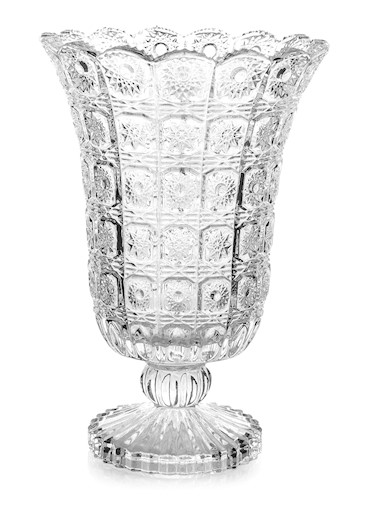 Vaso con Piede in Vetro Lavorato Stile Classico (H. 24 cm) Elegante e di grande impatto visivo, questo vaso con piede in vetro lavorato è l’ideale per esaltare la bellezza dei tuoi bouquet floreali o per aggiungere un tocco di lusso classico al tuo arredamento. Ispirato allo stile “Imperial” per la sua struttura slanciata e la ricca lavorazione, si distingue per: * Materiale: Vetro trasparente di alta qualità. * Design: Presenta una fitta e raffinata lavorazione a rilievo su tutta la superficie, tipica del vetro “tagliato” o cristallo intagliato (cut-crystal), creando un gioco di luci e riflessi spettacolare. * Forma: Calice slanciato con base a piede, per una stabilità eccellente e un profilo imponente. * Dimensioni: Altezza perfetta per centrotavola e credenze (circa 24 cm). Perfetto per allestimenti floreali, eventi speciali o semplicemente come sofisticato oggetto d’arredo, questo vaso porta in tavola e in casa un’eleganza senza tempo.