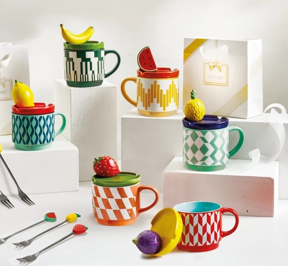 Tazza in porcellana “Le Fruttose” di Brandani con tappo decorato a forma di frutta. Motivi geometrici e colori vivaci. Ideale per caffè e tè.
