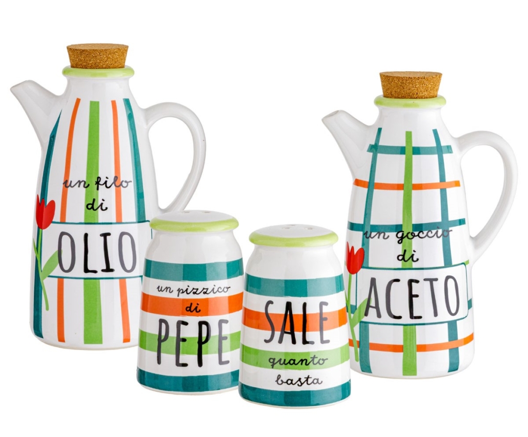Il design gioca con l’alternanza di decori iconici della linea lifestyle: l’oliera e il vasetto del sale sono caratterizzati da vivaci strisce verticali e orizzontali, mentre l’acetiera e il vasetto del pepe sfoggiano una moderna trama a griglia nei toni del verde, arancio e azzurro. Ogni pezzo è impreziosito dal caratteristico tulipano rosso e da scritte calligrafiche che aggiungono un tocco poetico: “un filo di OLIO”, “un goccio di ACETO”, “un pizzico di PEPE” e “SALE quanto basta”. Le ampolle sono dotate di tappi in sughero per preservare al meglio i condimenti, rendendo questo set un accessorio indispensabile per chi ama curare ogni minimo dettaglio.