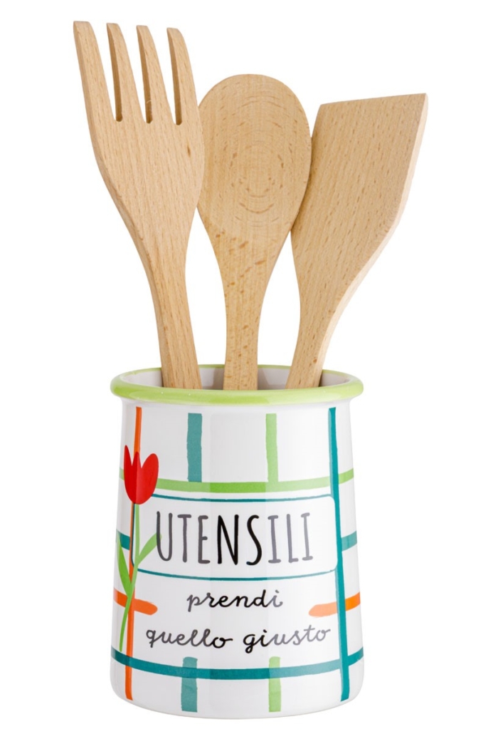 Il decoro presenta una moderna trama a griglia colorata nei toni del verde, arancio e azzurro, arricchita dall’iconico tulipano rosso della collezione. Al centro campeggia la scritta identificativa “UTENSILI” accompagnata dal termine “prendi” in un corsivo accogliente. Realizzato in ceramica resistente con bordo rifinito in verde lime, è l’accessorio ideale per chi cerca un’estetica curata e un’organizzazione impeccabile in cucina.