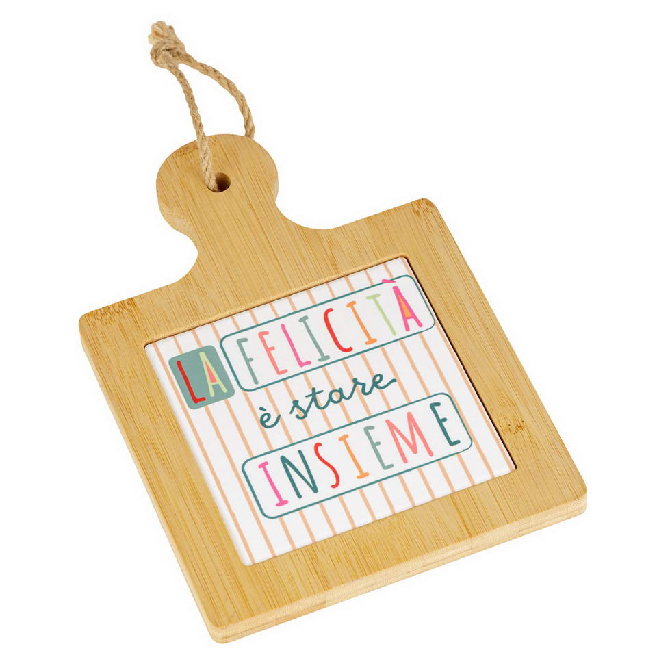 Tagliere decorativo Montemaggi in legno di bamboo cm 15×21 con stampa colorata “La felicità è stare insieme”. Perfetto per decorare la cucina o come originale idea regalo.
