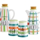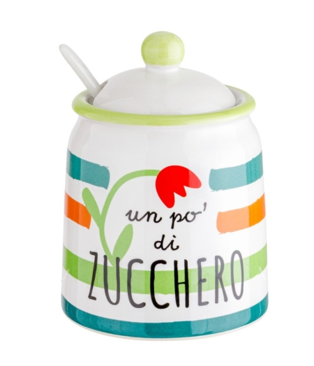 Rendi ancora più dolce il rito del caffè con la zuccheriera in ceramica Montemaggi. Questo piccolo gioiello di design unisce l’estetica vivace della linea lifestyle alla massima funzionalità quotidiana. Caratterizzata dalla classica forma a barattolo bombato, la zuccheriera è decorata con le iconiche strisce orizzontali multicolore (ottanio, arancio e verde lime) e il delicato tulipano rosso che contraddistingue la collezione.