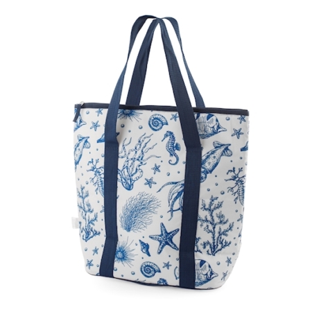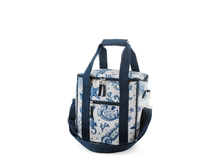 Elegante borsa termica da 12 litri in PEVA con raffinato decoro a tema marino blu su bianco. Ottimo isolamento termico, pratica tracolla e tasche esterne.