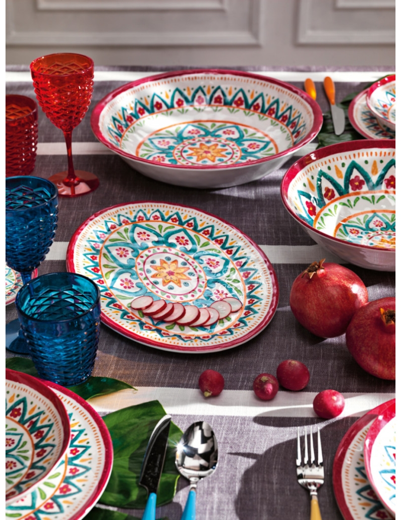 - Materiale: La melamina è un materiale leggero, resistente agli urti e alle alte temperature, ideale per un uso quotidiano, sia in casa che all’aperto.