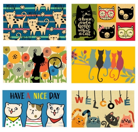 Il design “Mondo Gatto” presenta una varietà di adorabili illustrazioni e motivi a tema felino (come visibile nelle immagini), che spaziano da gatti stilizzati a simpatiche scene con gattini giocosi. Ogni zerbino di questa linea è un piccolo capolavoro che esprime amore per questi affascinanti animali.
