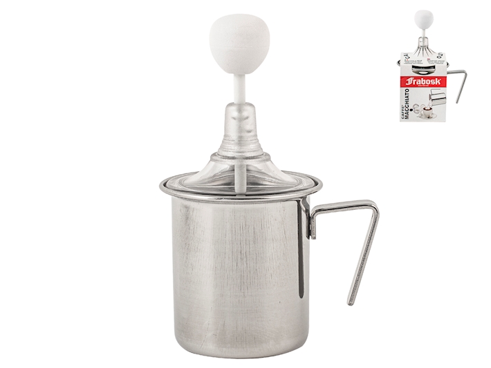 Frabosk Montalatte Manuale (Creamer) ‘Caffè Macchiato’ – 1 Tazza – Acciaio Inox Trasforma la tua pausa caffè in un’esperienza da bar con il Montalatte Manuale “Caffè Macchiato” di Frabosk, l’accessorio brevettato e indispensabile per ottenere una schiuma di latte densa e persistente in pochi secondi. Caratteristiche e Vantaggi: – Schiuma Perfetta: Progettato per produrre facilmente e rapidamente un’abbondante e vellutata schiuma di latte. È efficace anche partendo da latte freddo. – Capacità 1 Tazza: Il design compatto è ideale per preparazioni singole e veloci, come un cappuccino o un caffè macchiato. Le dimensioni tipiche sono di circa 6,5 cm di diametro e 7 cm di altezza. – Materiale di Alta Qualità: Realizzato in robusto acciaio inossidabile 18/10, garantisce igiene, lunga durata e inalterabilità. – Praticità Totale: Non richiede elettricità o batterie grazie al suo semplice funzionamento manuale. È completamente lavabile in lavastoviglie per una pulizia rapida. – Versatilità in Cucina: Perfetto non solo per cappuccino e caffè macchiato, ma anche per Tropical latte e menta, Frappè, Irish coffee e per montare l’albume d’uovo. – Adatto a Piani Cottura: Il modello base 1 tazza è adatto per piani cottura a gas, elettrici e in vetroceramica. Alcune versioni della linea Frabosk sono idonee anche per l’induzione. Un prodotto originale e brevettato, sinonimo di qualità Made in Italy nel settore degli utensili da cucina.