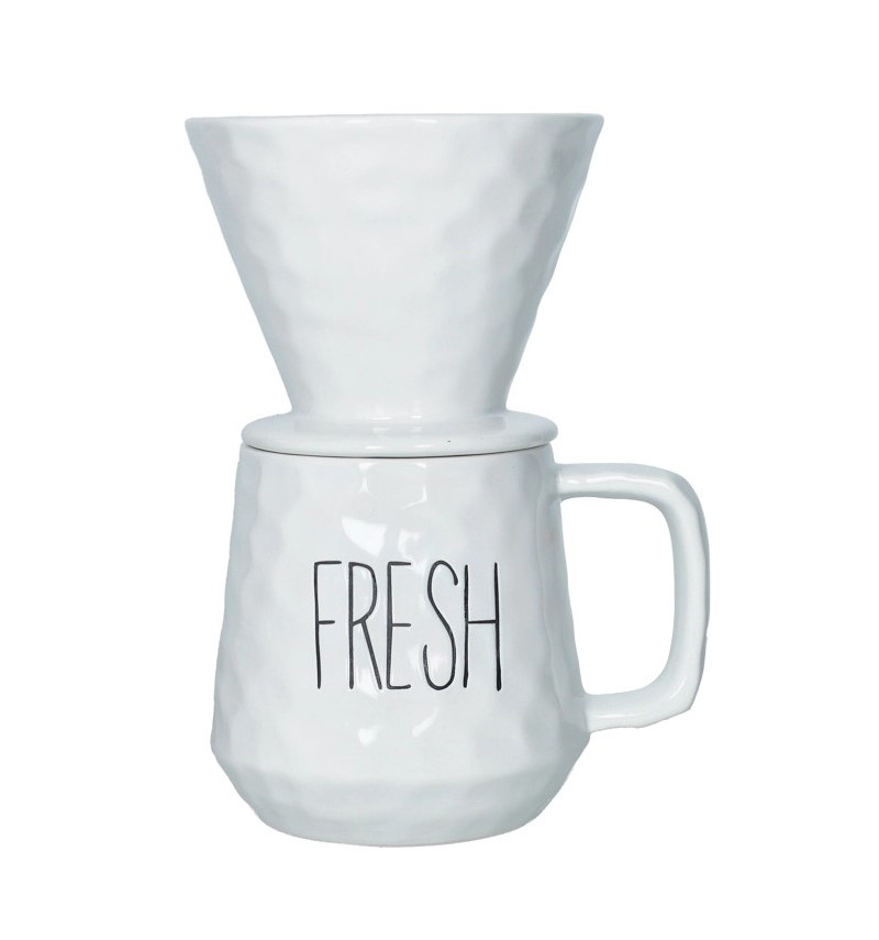 Il set è realizzato in ceramica stoneware, scelta per la sua capacità di trattenere il calore a lungo. La superficie è caratterizzata da una finitura a nido d’ape o martellata, che regala piacevoli giochi di luce e una presa sicura. Il candore del bianco è interrotto solo dalla scritta “FRESH” in nero, un dettaglio di stile che richiama le tendenze dell’arredo contemporaneo e scandinavo.