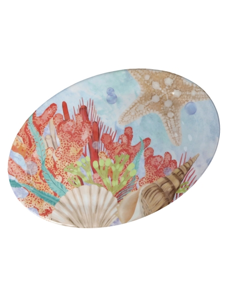 Vassoio ovale in melamina da 35 cm con decorazioni tema oceano: coralli, conchiglie e stella marina. Ideale per servire e decorare.