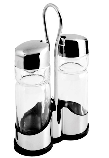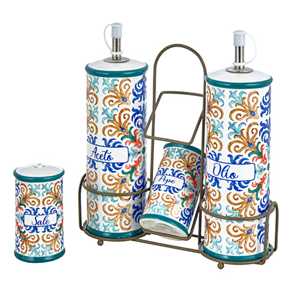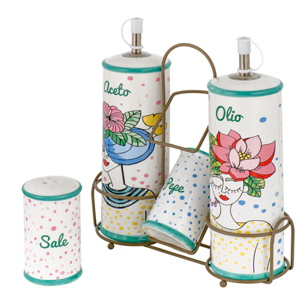 - Stand con Maniglia: Il supporto (stand) in metallo (Inox) permette di trasportare comodamente il set ed è ideale per tenere ordinati olio e aceto a portata di mano.