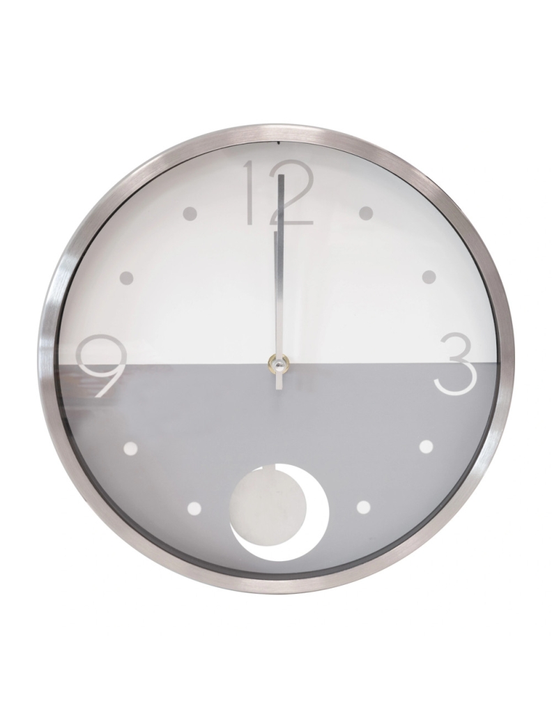 Il design “Split” è caratterizzato da un quadrante diviso orizzontalmente in due sezioni cromatiche: una superiore in un bianco luminoso e una inferiore in un grigio tenue (o argento, a seconda dell’illuminazione), creando un contrasto sofisticato. La cornice in un elegante color argento (probabilmente metallo o finitura metallizzata) incornicia il tutto, conferendo un aspetto pulito e contemporaneo. I numeri delle ore, essenziali e stilizzati, sono posizionati strategicamente per una lettura chiara.