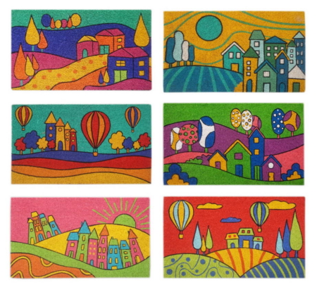 Questo zerbino della collezione Naif è pensato per chi vuole accogliere i propri ospiti con un’estetica sognante e vibrante. Le grafiche raffigurano paesaggi incantati ricchi di dettagli: colline sinuose, villaggi con casette colorate, mongolfiere che solcano il cielo e alberi stilizzati dai pattern fantasiosi. Ogni illustrazione sembra uscita da un libro di fiabe, utilizzando una palette cromatica intensa che spazia dal blu profondo del crepuscolo all’arancio radioso del tramonto.