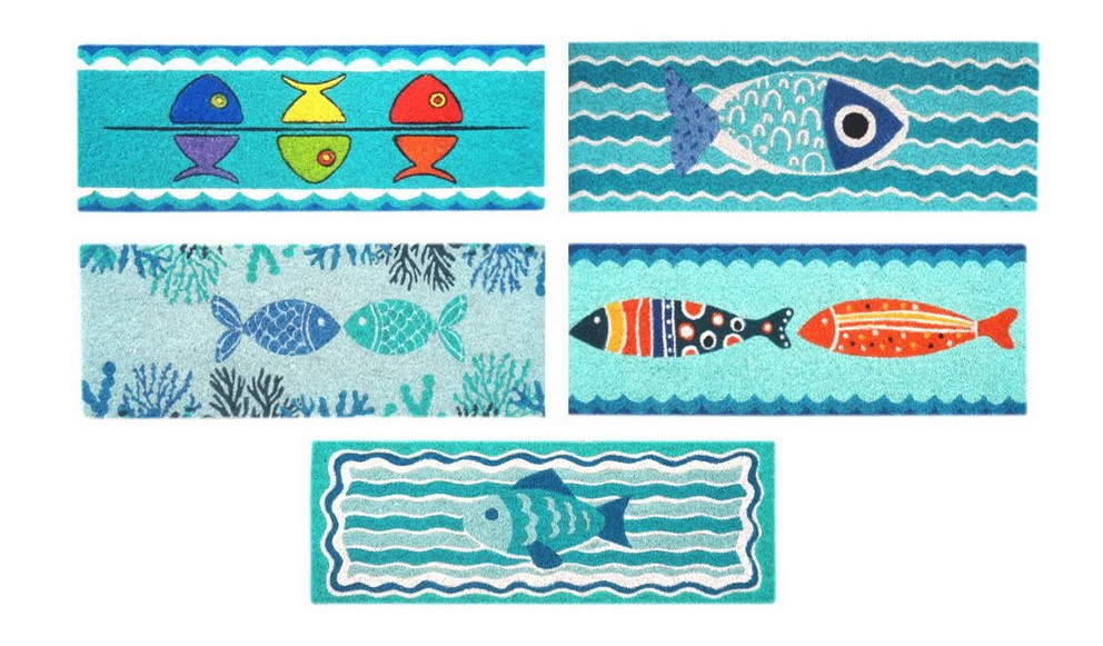 Questo zerbino unisce l’utilità di un accessorio per la pulizia a un design dinamico e solare. Caratterizzato da una forma allungata e sottile (70×25 cm), è stato progettato specificamente per rivestire perfettamente i gradini delle scale o per adattarsi a ingressi con spazi di manovra limitati. Le grafiche presentano vivaci pesci stilizzati su un fondo azzurro che richiama il movimento delle onde, decorati con pattern a righe, pois e mosaici che celebrano lo stile mediterraneo.