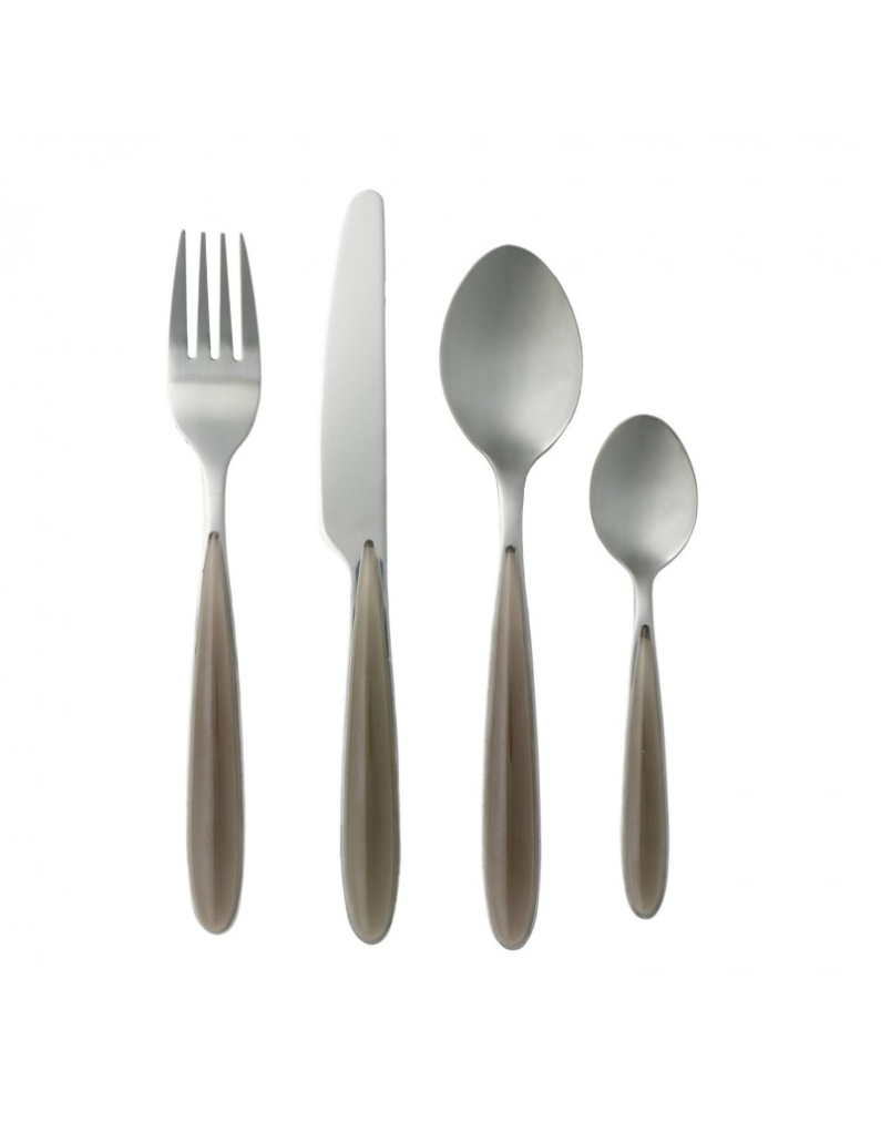Ogni pezzo è realizzato in acciaio inox di alta qualità, garantendo durabilità, resistenza alla corrosione e una facile pulizia. Il design moderno si distingue per i manici nel delicato colore tortora, che aggiungono un tocco di eleganza discreta e si abbinano splendidamente a qualsiasi stile di apparecchiatura, dal classico al contemporaneo.