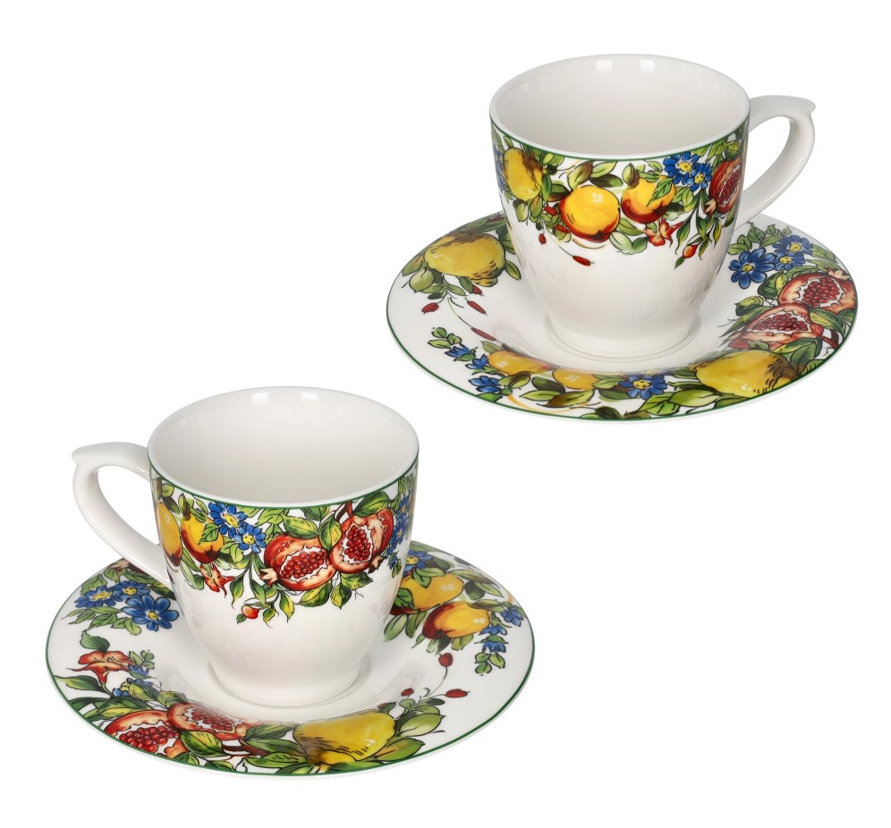 La collezione Prospero celebra l’abbondanza. Ogni tazza e piattino è impreziosito da illustrazioni vivide di melograni spaccati, agrumi dorati e fogliame rigoglioso, incorniciati da un sottile bordo verde che ne esalta la luminosità. La porcellana bianca fa da tela perfetta per questi decori, rendendo il set un vero elemento d’arredo per la tua cucina o sala da pranzo.