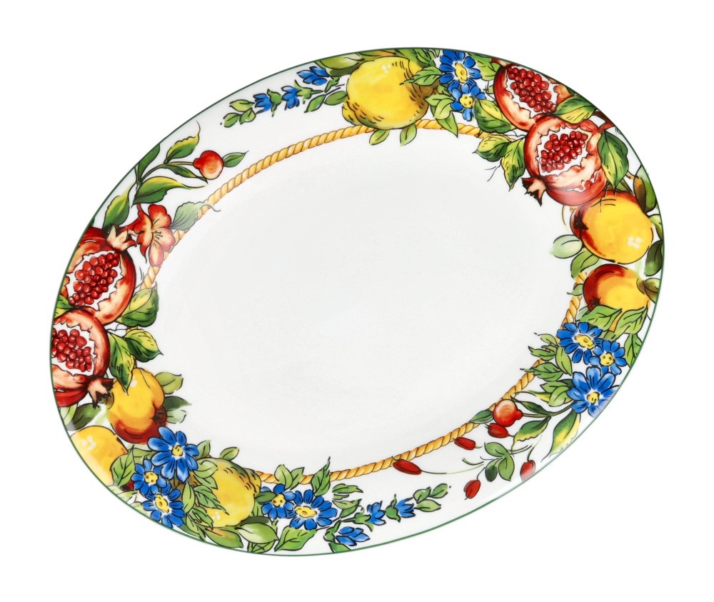 Il decoro Prospero è un inno alla fertilità e alla gioia di vivere. Il bordo del vassoio è impreziosito da illustrazioni vivide di melograni rossi, agrumi dorati e delicati fiori blu, il tutto incorniciato da un dettaglio a cordina che aggiunge un tocco rustico-chic. La superficie bianca e lucida della porcellana fa risaltare ogni pietanza, garantendo una presentazione impeccabile.