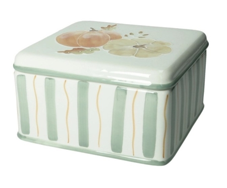 Realizzata in pregiata dolomite, questa scatola si distingue per il suo design accattivante. Le pareti sono decorate con un motivo a righe verticali in delicate tonalità pastello, che richiamano i colori delle foglie e dei raccolti. Il coperchio è arricchito da una decorazione in rilievo con vivaci zucche e fiori autunnali, che creano un perfetto equilibrio tra rustico e raffinato.