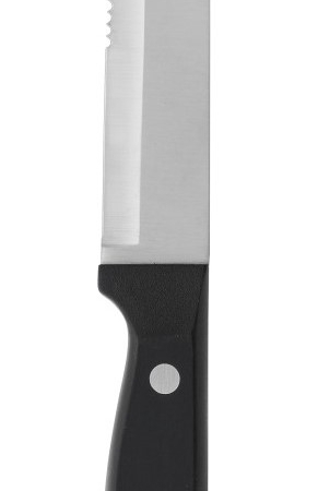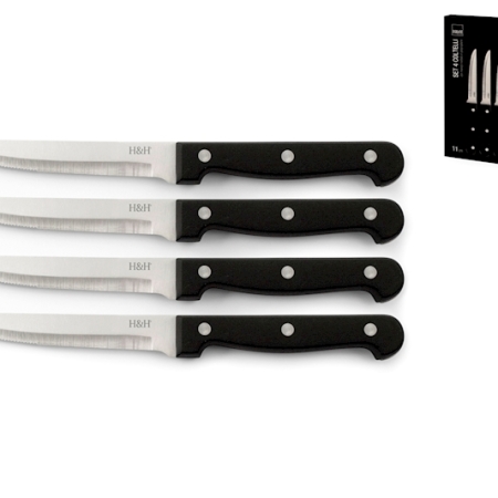 Ogni coltello è dotato di una robusta lama in acciaio inossidabile con un’affilatura seghettata, ideale per tagliare con facilità carne, pane e qualsiasi pietanza si trovi sulla tua tavola. L’impugnatura ergonomica di colore nero assicura una presa comoda e sicura, rendendo il taglio piacevole e senza sforzo.