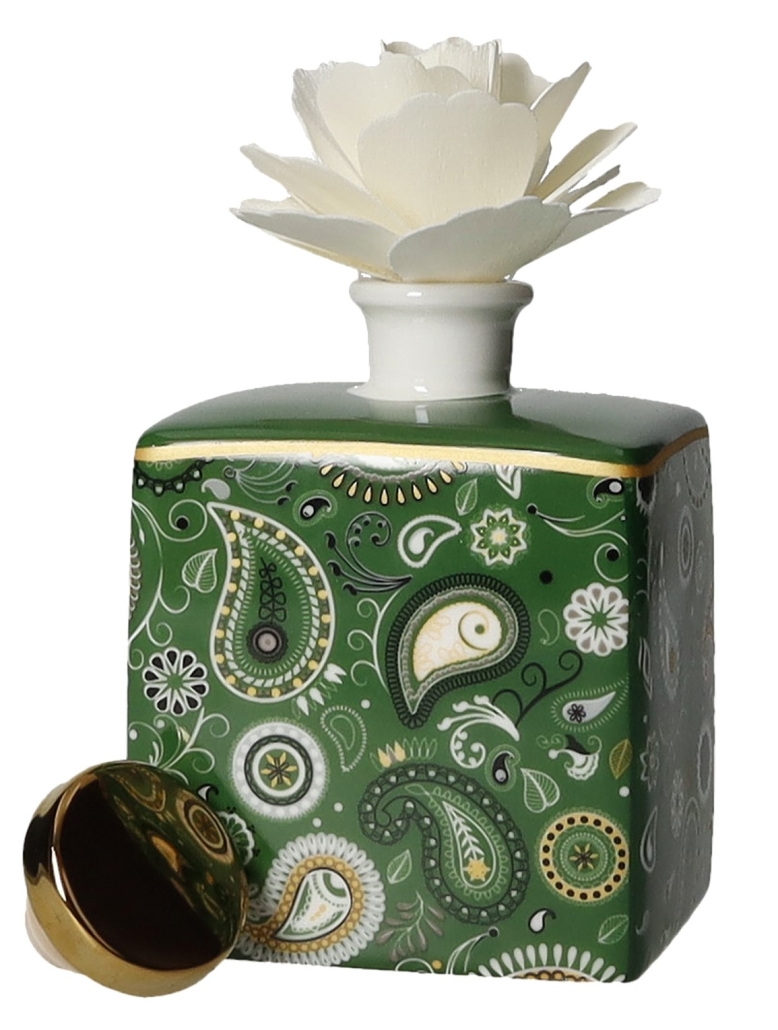 - Design: Il diffusore presenta un design elegante e moderno, caratterizzato da un motivo a paisley colorato su sfondo verde. La forma quadrata e il coperchio dorato aggiungono un tocco di raffinatezza.