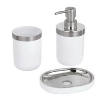 Rinnova il tuo bagno con questo set di accessori dal design pulito e moderno. Realizzato in PVC bianco con un elegante bordo metallico, il set include un bicchiere, un dispenser di sapone liquido e un portasapone. Perfetto per aggiungere un tocco di stile e funzionalità al tuo bagno.