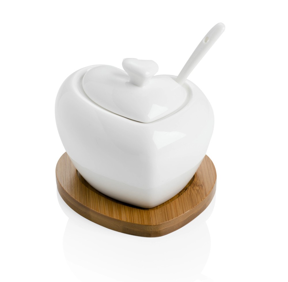 Componenti: Include contenitore a cuore, coperchio, cucchiaino e supporto in legno.