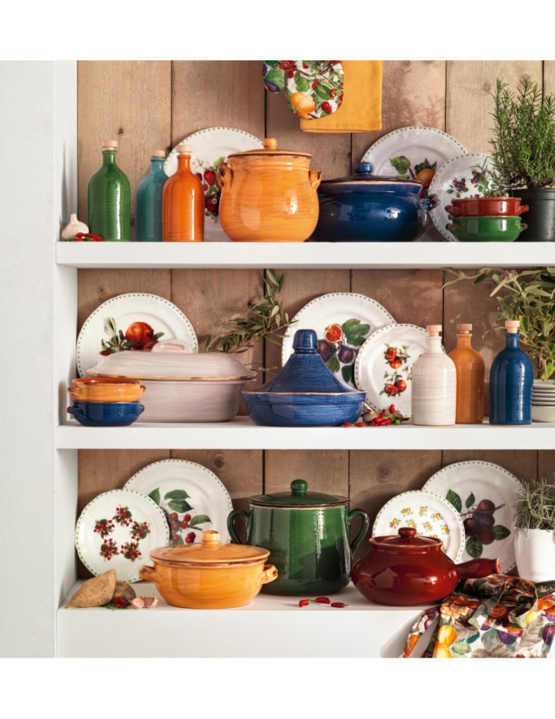 La terracotta è un materiale eccellente per la cottura, in quanto distribuisce il calore in modo lento e uniforme e lo trattiene a lungo, garantendo una cottura omogenea e che i cibi rimangano caldi a lungo. Il suo design tradizionale, con manici robusti integrati e il coperchio abbinato, non è solo funzionale per la cottura ma la rende anche un bellissimo pezzo da esporre, perfetto per servire direttamente in tavola, aggiungendo un tocco di colore e un’atmosfera accogliente e familiare.
