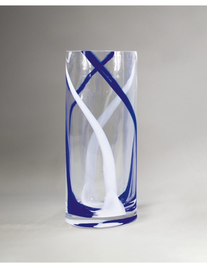 Realizzato in vetro soffiato a bocca con una tecnica manuale di soffiatura, questo vaso si distingue per il suo design elegante e sinuoso, caratterizzato da un intreccio di fili blu e bianchi che ricorda le onde del mare.