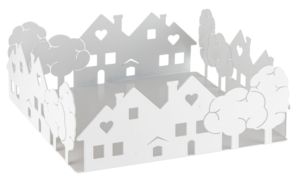 Il portatovaglioli “Village” di Montemaggi è un accessorio pratico e decorativo che aggiunge un tocco di charme alla tua tavola. Realizzato in metallo bianco, si distingue per l’originale design traforato, che riproduce piccole casette con finestre a cuore e a croce, creando un’atmosfera fiabesca e accogliente.