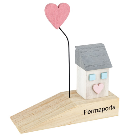- Struttura: Il fermaporta è composto da una base in legno naturale che funge da cuneo per tenere aperta la porta. Sulla base è posizionata una piccola casetta colorata, realizzata in legno e dipinta a mano con colori pastello delicati.