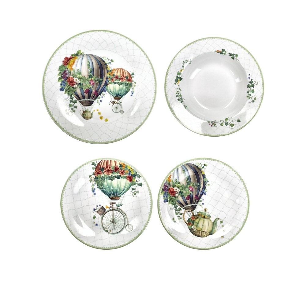 6 Piatti Piani: Ampi e decorati con la scena principale delle mongolfiere in volo.