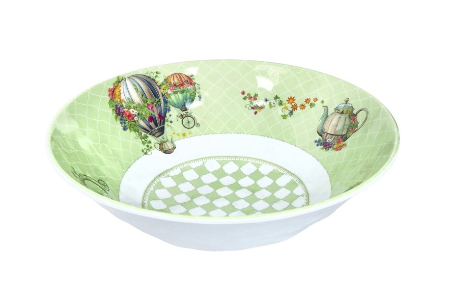 Il design della ciotola riprende il tema iconico della collezione Wonderland: l’interno è decorato con mongolfiere fiorite, teiere volanti e tralci di fiori che sembrano fluttuare su un fondo a trama geometrica verde pastello. La base interna presenta un raffinato motivo a scacchi verde e bianco, che crea un contrasto dinamico e moderno con le illustrazioni botaniche.