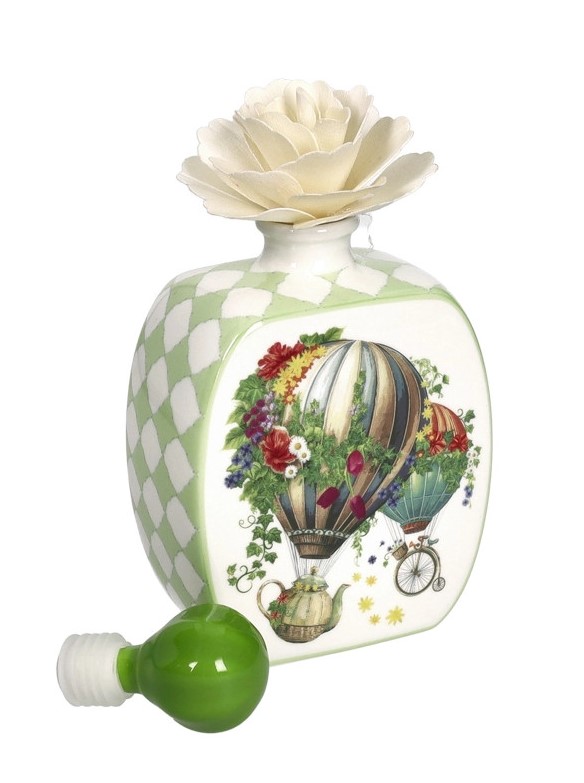Il Diffusore Wonderland da 400 ml è il pezzo forte della collezione per chi desidera una profumazione costante e un oggetto d’arredo di grande impatto visivo. La porcellana bianca, impreziosita da una delicata trama a losanghe verde pastello, fa da cornice a un mondo fantastico fatto di viaggi in mongolfiera e giardini sospesi.